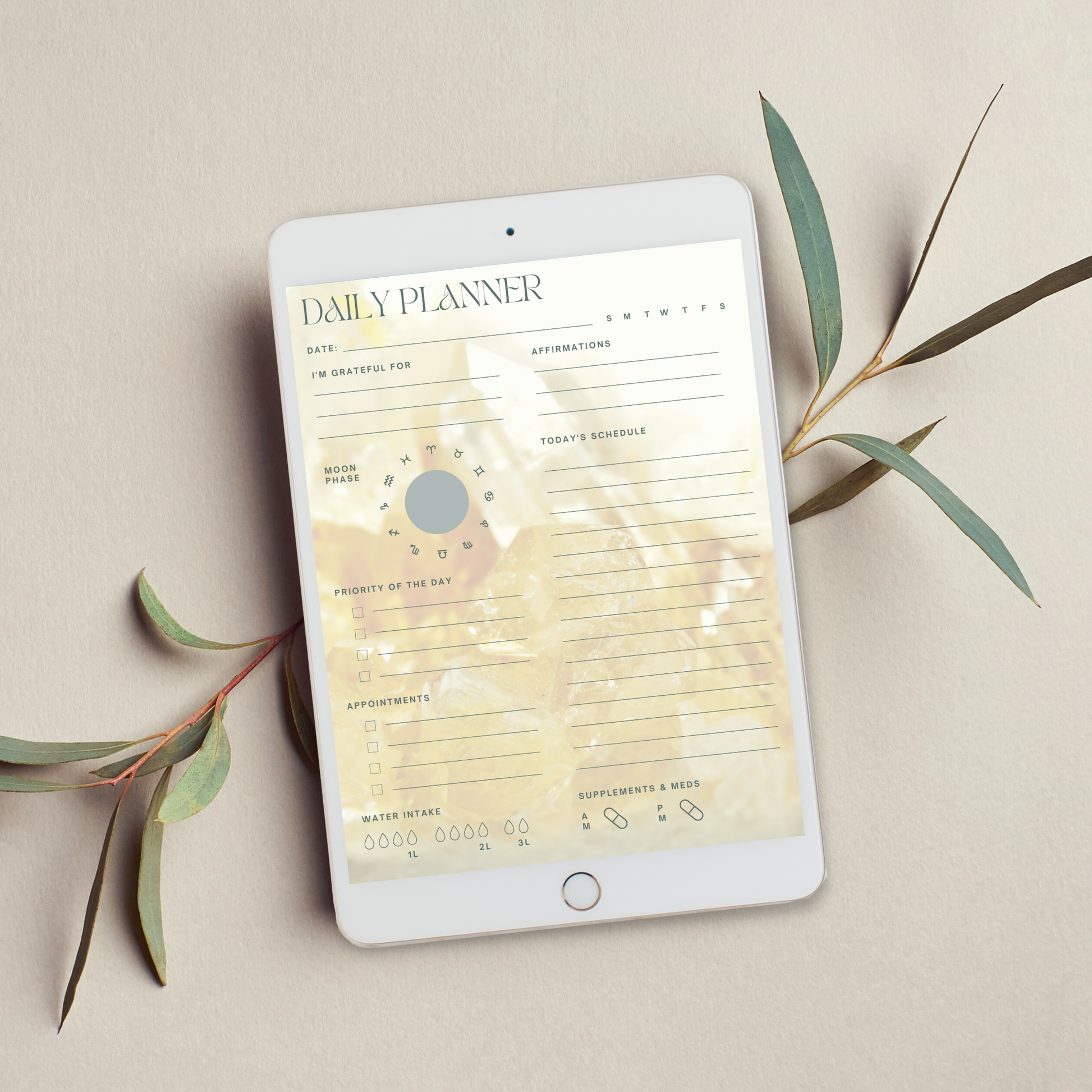 Featuring the energizing power of Citrine, this planner is available as a digital download in PDF format, making it easily accessible on any PDF-compatible app, such as GoodNotes and Notability. You also have the option to print it out and use it as a traditional planner. Whether you're looking to manifest abundance, improve your relationships, or achieve your career goals, this planner is the perfect companion on your journey towards creating the life you desire. Get your hands on this powerful tool and start manifesting your dream life today!