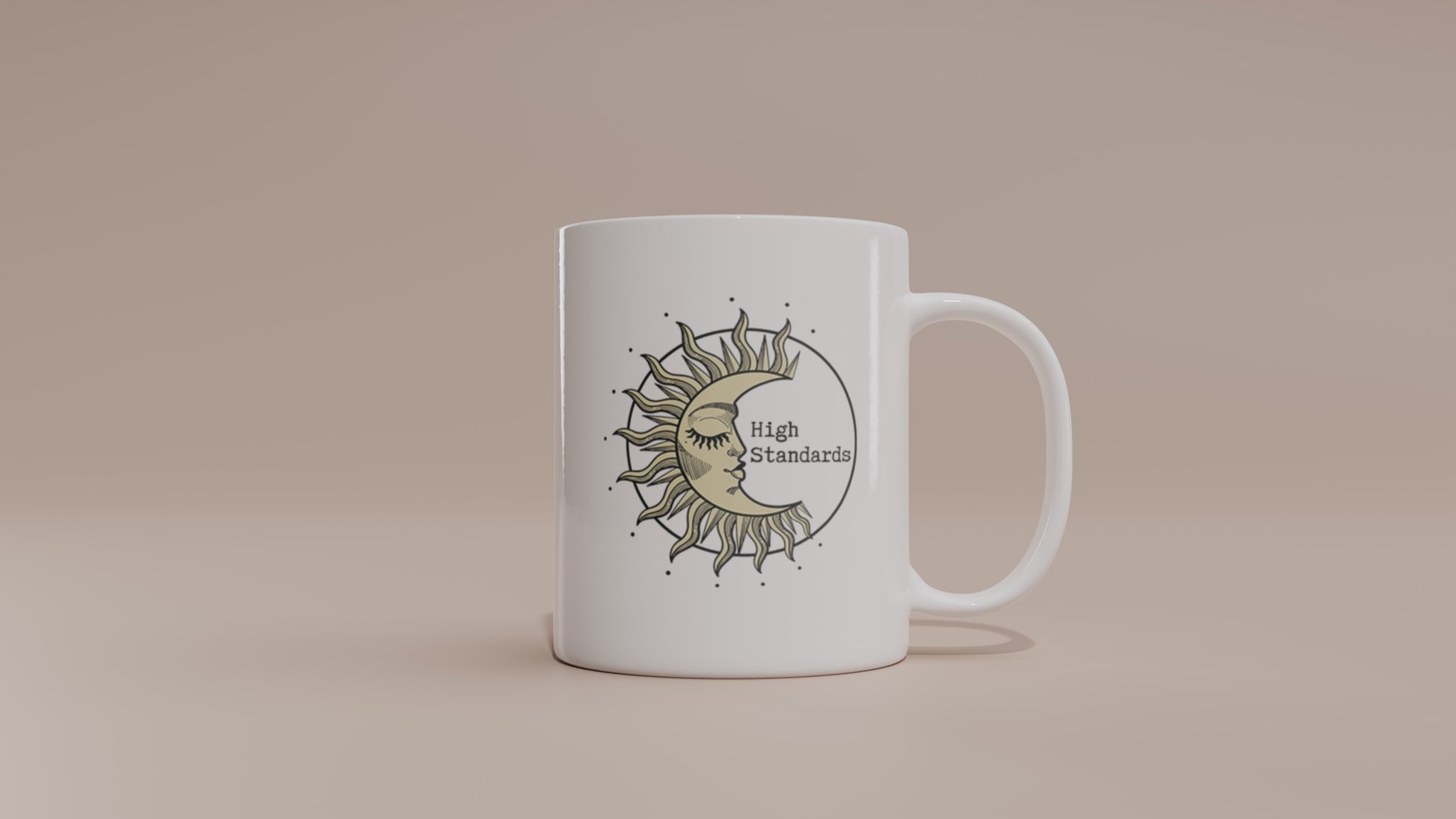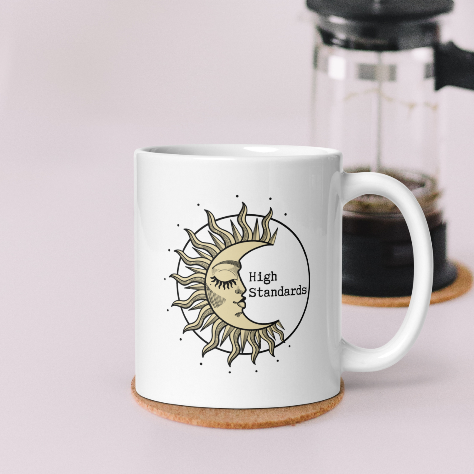 Raise your standards and elevate your morning coffee routine with our High Standards celestial mug. Made from premium ceramic, this mug is both microwave and dishwasher-safe for your convenience. The eye-catching design features an intricate celestial design and is printed on both sides, making it perfect for both left and right-handed drinkers. Available in 11oz and 15oz sizes to suit your preferred beverage. Start each day with a little inspiration and a lot of style, with our High Standards celestial mug.