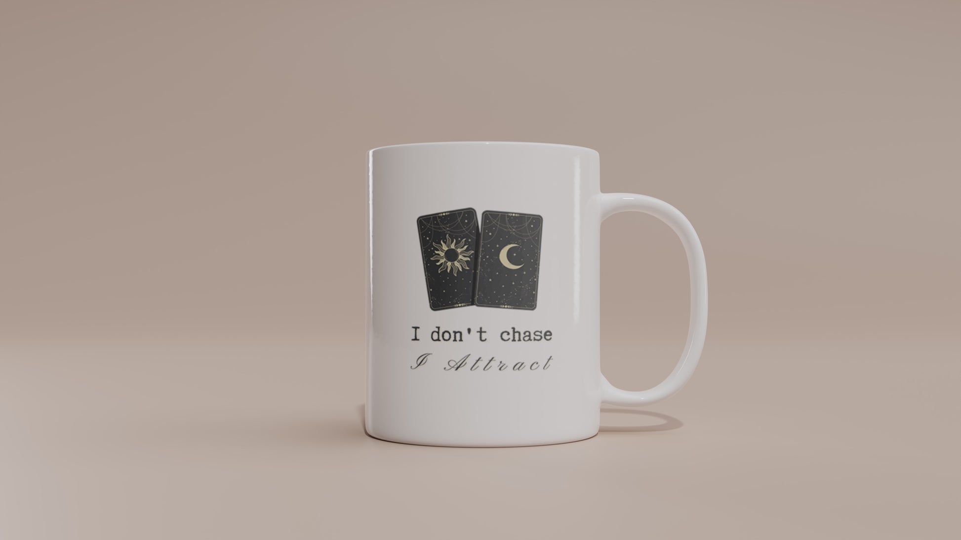 Attract your desired reality with our "I Don't Chase I Attract" tarot card mug. Made from high-quality ceramic, this mug is both microwave and dishwasher-safe for your convenience. The bold design features an illustration of the sun and moon tarot cards, reminding you to focus on manifesting your intentions rather than chasing after them. The design is printed on both sides, so it's perfect for left and right-handed drinkers. Available in 11oz and 15oz sizes. Start your day off with a positive affirmation and a hot drink.