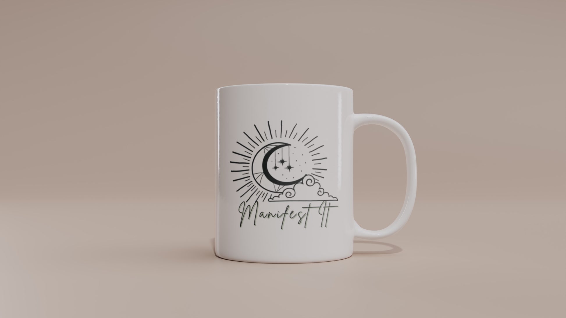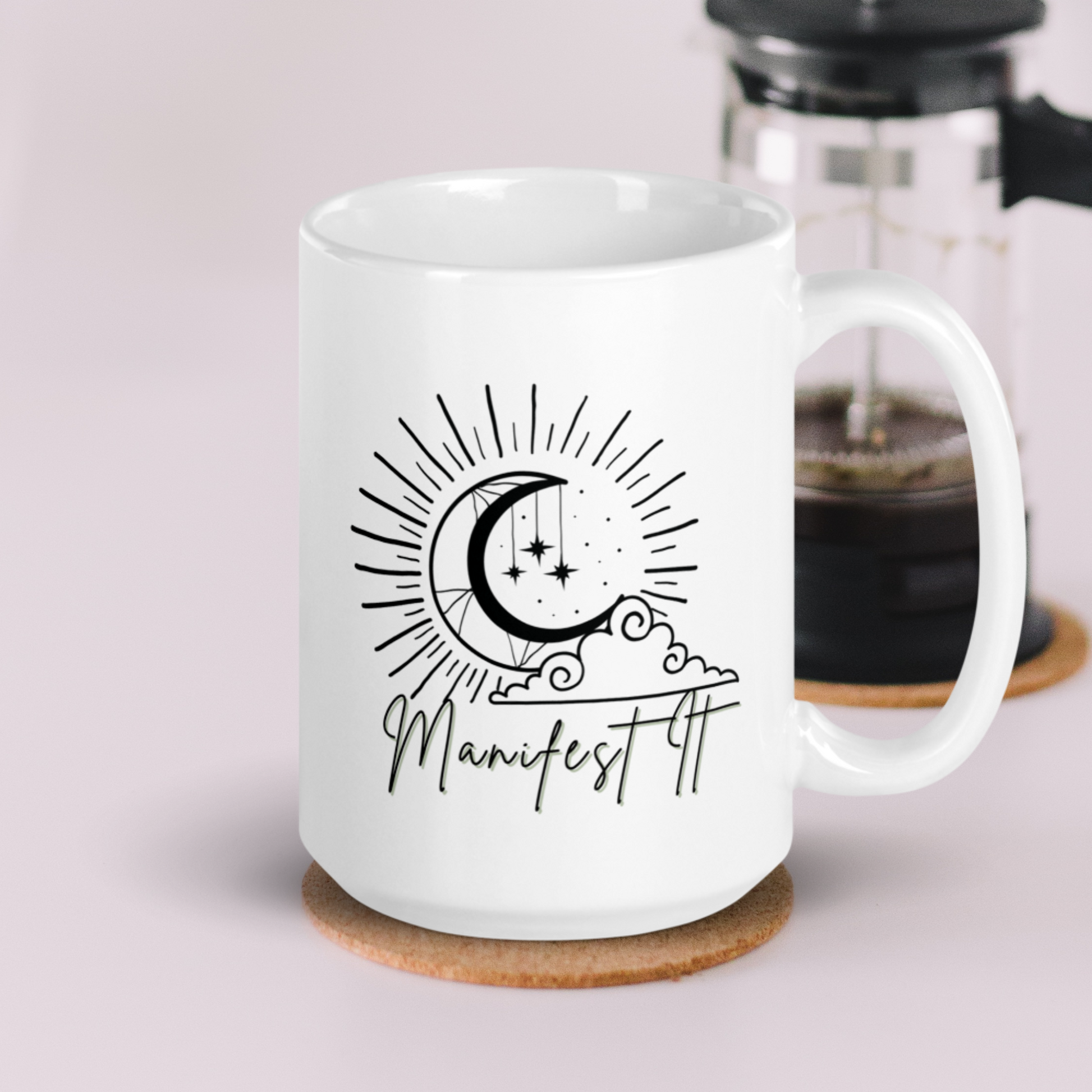 Bring your dreams to reality with our "Manifest It" celestial mug. Made from high-quality ceramic, this mug is both microwave and dishwasher-safe for your convenience. The stunning design features an intricate celestial illustration and the powerful phrase "Manifest It", reminding you to focus on making your intentions a reality. The design is printed on both sides, so it's perfect for left and right-handed drinkers. Available in 11oz and 15oz sizes to suit your preferred beverage. Start each day with a reminder to manifest your goals and a hot drink with our Manifest It celestial mug.